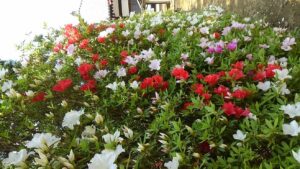 色とりどりのツツジからなる垣根(禅塾裏庭)